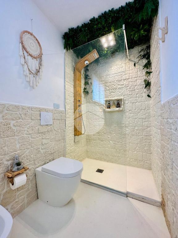 La camera matrimoniale è rifinita con gusto e pensata per garantire tranquillità e riposo. Il bagno, moderno ed elegante, è dotato di una comoda doccia walk-in.